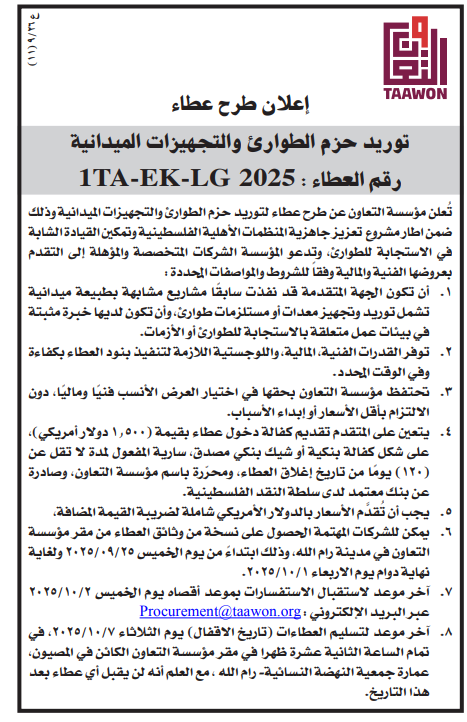 تُعلن مؤسسة التعاون عن طرح عطاء لتوريد حزم الطوارئ والتجهيزات الميدانية وذلك ضمن اطار مشروع تعزيز جاهزية المنظمات الأهلية الفلسطينية وتمكين القيادة الشابة في الاستجابة للطوارئ، وتدعو المؤسسة الشركات المتخصصة والمؤهلة إلى التقدم بعروضها الفنية والمالية وفقا للشروط والمواصفات المحددة :