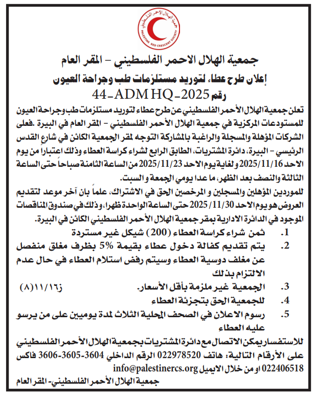 تعلن جمعية الهلال الأحمر الفلسطيني عن طرح عطاء لتوريد مستلزمات طب وجراحة العيون للمستودعات المركزية في جمعية الهلال الأحمر الفلسطيني - المقر العام في البيرة .فعلى الشركات المؤهلة والمسجلة والراغبة بالمشاركة التوجه لمقر الجمعية الكائن في شارع القدس الرئيسي - البيرة، دائرة المشتريات، الطابق الرابع لشراء كراسة العطاء وذلك اعتبارا من يوم الاحد 2025/11/16 ولغاية يوم الاحد 2025/11/23 من الساعة الثامنة صباحا حتى الساعة الثالثة والنصف بعد الظهر ، ما عدا يومي الجمعة والسبت.
