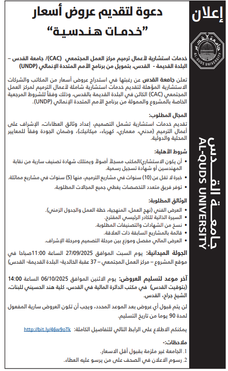 تعلن جامعة القدس عن رغبتها في استدراج عروض أسعار من المكاتب والشركات الاستشارية المؤهلة لتقديم خدمات استشارية شاملة لأعمال الترميم لمركز العمل المجتمعي (CAC الكائن في البلدة القديمة بالقدس، وذلك وفقاً للشروط المرجعية