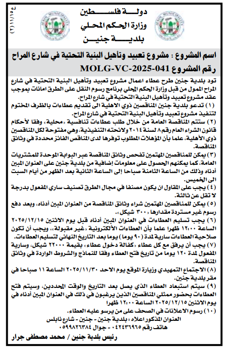 (۱) تدعو بلدية جنين المناقصين ذوي الاهلية الى تقديم عطاءات بالظرف المختوم لتنفيذ مشروع تعبيد وتأهيل البنية التحتية في شارع المراح.