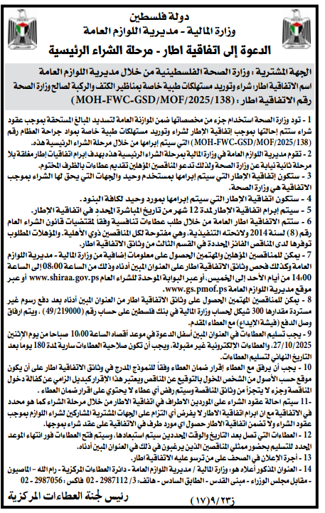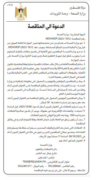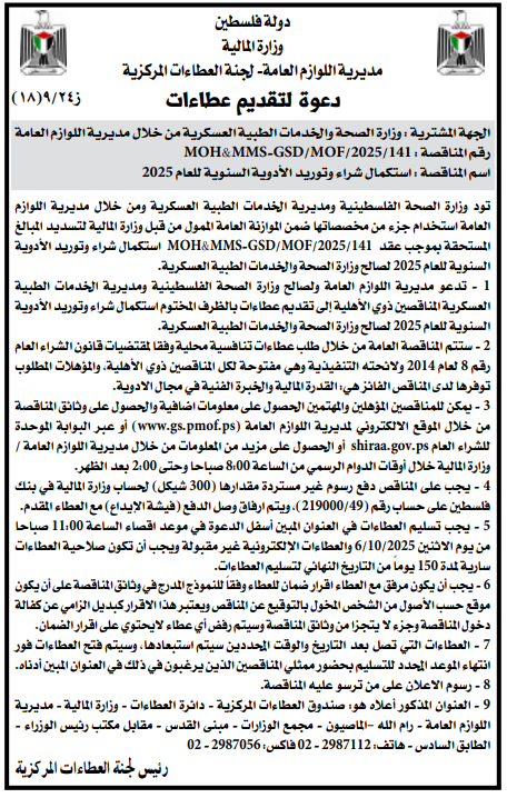 1 - تدعو مديرية اللوازم العامة ولصالح وزارة الصحة الفلسطينية ومديرية الخدمات الطبية العسكرية المناقصين ذوي الأهلية إلى تقديم عطاءات بالظرف المختوم استكمال شراء وتوريد الأدوية السنوية للعام 2025 لصالح وزارة الصحة والخدمات الطبية العسكرية.