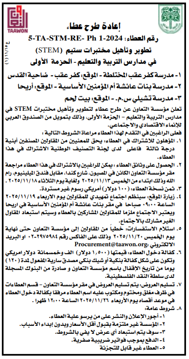 تعلن مؤسسة التعاون عن طرح عطاء لتطوير وتأهيل مختبرات STEM في مدارس التربية والتعليم - الحزمة الأولى، وذلك بتمويل من الصندوق العربي للإنماء الاقتصادي والاجتماعي.