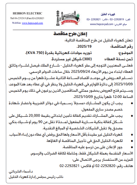 فعلى المعنيين التوجه إلى مقر كهرباء الخليل - شارع الملك فيصل لشراء وثائق العطاء ابتداء من يوم الأربعاء 2025/09/24 خلال ساعات الدوام الرسمي.