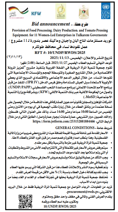 تقوم جمعية تنمية المرأة الريفية في الضفة الغربية بتنفيذ مشروع تعزيز المرونة | الاقتصادية من خلال المشاريع الصغيرة والمتوسطة الحجم والمؤسسات الاجتماعية التي تقودها النساء من خلال توفير الدعم الاجتماعي والاقتصادي السريع الذي يعطي الأولوية لاستعادة سبل العيش المستدامة وخلق فرص الدخل (IPRIV) المنفذ من قبل برنامج الأمم المتحدة الإنمائي / برنامج مساعدة الشعب الفلسطيني (UNDP/PAPP) والممول من الحكومة الألمانية عبر بنك التنمية الألماني (KFW)، وبشراكة مع وزارة التنمية الاجتماعية (MoSD.) الشركات المؤهلين والمسجلين قانونياً مدعوون للمشاركة في هذه المنافسة من خلال الحصول على نسخة معتمدة من وثائق العطاء من خلال زيارة مكتب الجمعية في أي يوم من الاثنين وحتى الخميس من الساعة 10:00 صباحاً وحتى 14:00 مساءً، وذلك على العنوان التالي: فلسطين رام الله، المصيون، دوار التشريعي، عمارة صابات (بجوار عمارة واصل)، الطابق الثاني او من خلال الرابط التالي: 253152881884466/https://form.jotform.com