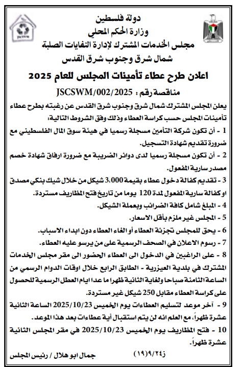 يعلن المجلس المشترك شمال شرق وجنوب شرق القدس عن رغبته بطرح عطاء تأمينات المجلس حسب كراسة العطاء وذلك وفق الشروط التالية: