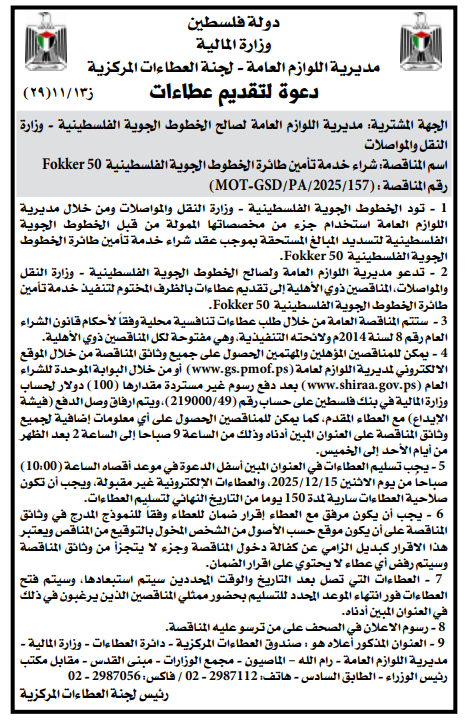 اسم المناقصة: شراء خدمة تأمين طائرة الخطوط الجوية الفلسطينية 50 Fokker رقم المناقصة : (2025/157/MOT-GSD/PA)