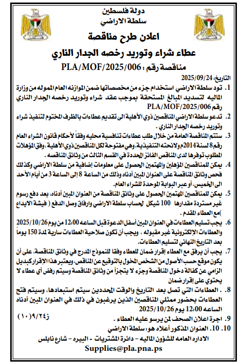3 - يمكن للمناقصين المؤهلين والمهتمين الحصول على معلومات اضافية والحصول على وثائق المناقصة من خلال الموقع الالكتروني لمديرية اللوازم العامة (www.gs.pmof.ps) أو عبر البوابة الموحدة للشراء العام shiraa.gov.ps أو الحصول على مزيد من المعلومات من خلال مديرية اللوازم العامة / وزارة المالية خلال أوقات الدوام الرسمي من الساعة 8:00 صباحا وحتى 2:00 بعد الظهر.