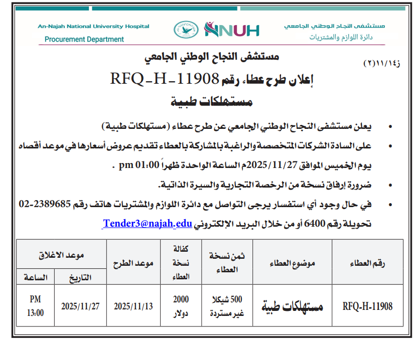 إعلان طرح عطاء رقم 11908-RFQ-H