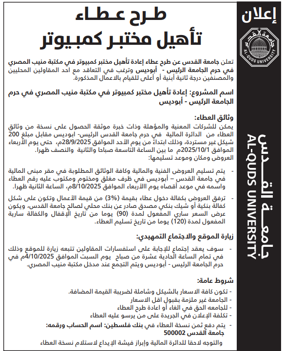 تعلن جامعة القدس عن طرح عطاء إعادة تأهيل مختبر كمبيوتر في مكتبة منيب المصري في حرم الجامعة الرئيس - أبوديس وترغب في التعاقد مع احد المقاولين المحليين والمصنفين درجة ثانية أبنية أو أعلى للقيام بالاعمال المذكورة.