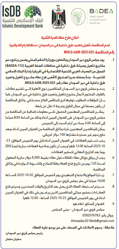 اسم المناقصة: تأهيل وتعبيد طرق داخلية في دير السودان / محافظة رام الله والبيرة