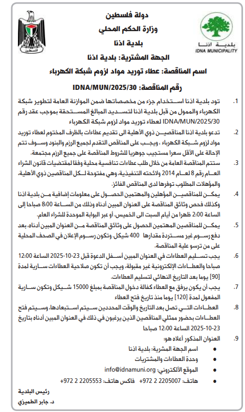 9 - آخر موعد لتسليم العطاءات يوم الخميس 2025/10/23 الساعة الثانية عشرة ظهراً، مع العلم انه لن يتم استقبال أية عطاءات بعد هذا الموعد.