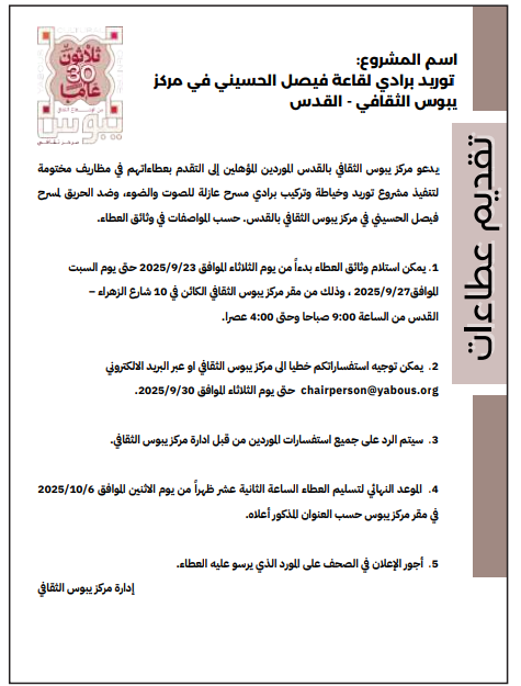 يدعو مركز يبوس الثقافي بالقدس الموردين المؤهلين إلى التقدم بعطاءاتهم في مظاريف مختومة لتنفيذ مشروع توريد وخياطة وتركيب برادي مسرح عازلة للصوت والضوء، وضد الحريق المسرح فيصل الحسيني في مركز يبوس الثقافي بالقدس. حسب المواصفات في وثائق العطاء.