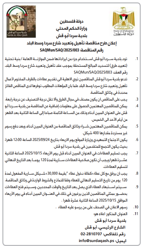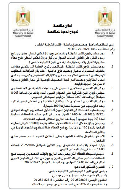 اسم المناقصة: تأهيل وتعبيد المدخل الجنوبي اللبن الشرقية نابلس