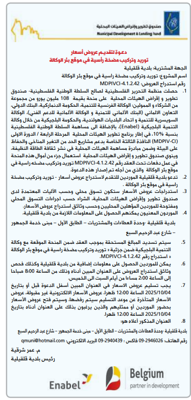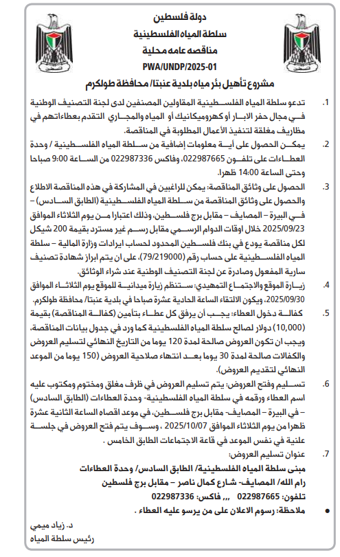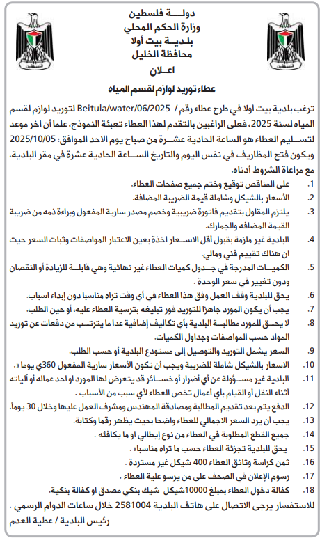 ترغب بلدية بيت أولا في طرح عطاء رقم / 06/2025/Beitula/water لتوريد لوازم لقسم المياه لسنة 2025، فعلى الراغبين بالتقدم لهذا العطاء تعبئة النموذج، علما أن آخر موعد لتسليم العطاء . هو و الساعة الحادية عشرة من صباح يوم الاحد الموافق 2025/10/05 ويكون فتح المظاريف في نفس اليوم والتاريخ الساعة الحادية عشرة في مقر البلدية مع مراعاة الشروط أدناه.