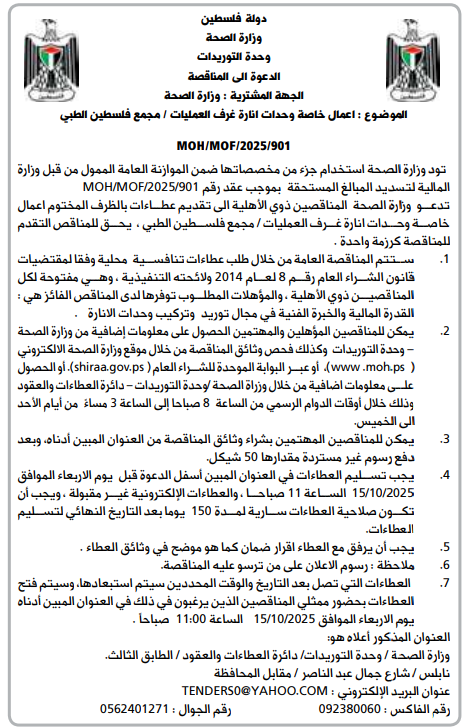 تود وزارة الصحة استخدام جزء من مخصصاتها ضمن الموازنة العامة الممول من قبل وزارة المالية لتسديد المبالغ المستحقة بموجب عقد رقم 2025/901/MOH/MOF تدعو وزارة الصحة المناقصين ذوي الأهلية الى تقديم عطاءات بالظرف المختوم اعمال خاصة وحدات انارة غرف العمليات / مجمع فلسطين الطبي ، يحق للمناقص التقدم للمناقصة كرزمة واحدة .