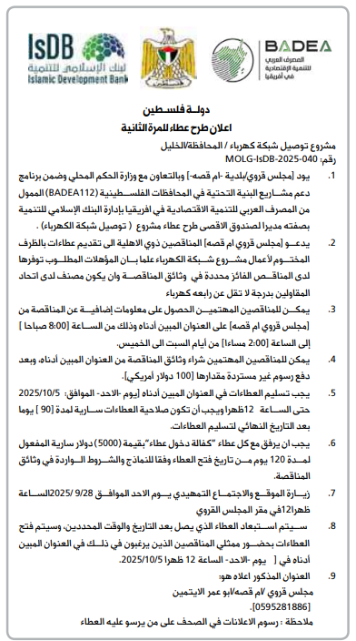 مشروع توصيل شبكة كهرباء / المحافظة الخليل رقم 040-2025-MOLG-IsDB