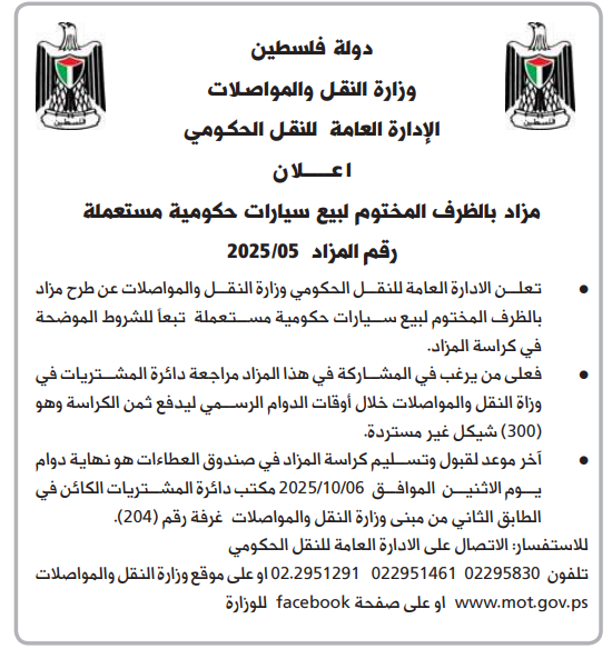 للاستفسار الاتصال على الادارة العامة للنقل الحكومي تلفون 02295146102295830 02.2951291 او على موقع وزارة النقل والمواصلات www.mot.gov.ps او على صفحة facebook للوزارة