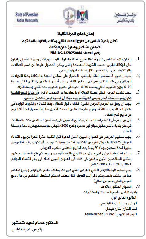تعلن بلدية نابلس عن طرح العطاء التالي وذلك بالظرف المختوم تضمين تشغيل وادارة خان الوكالة